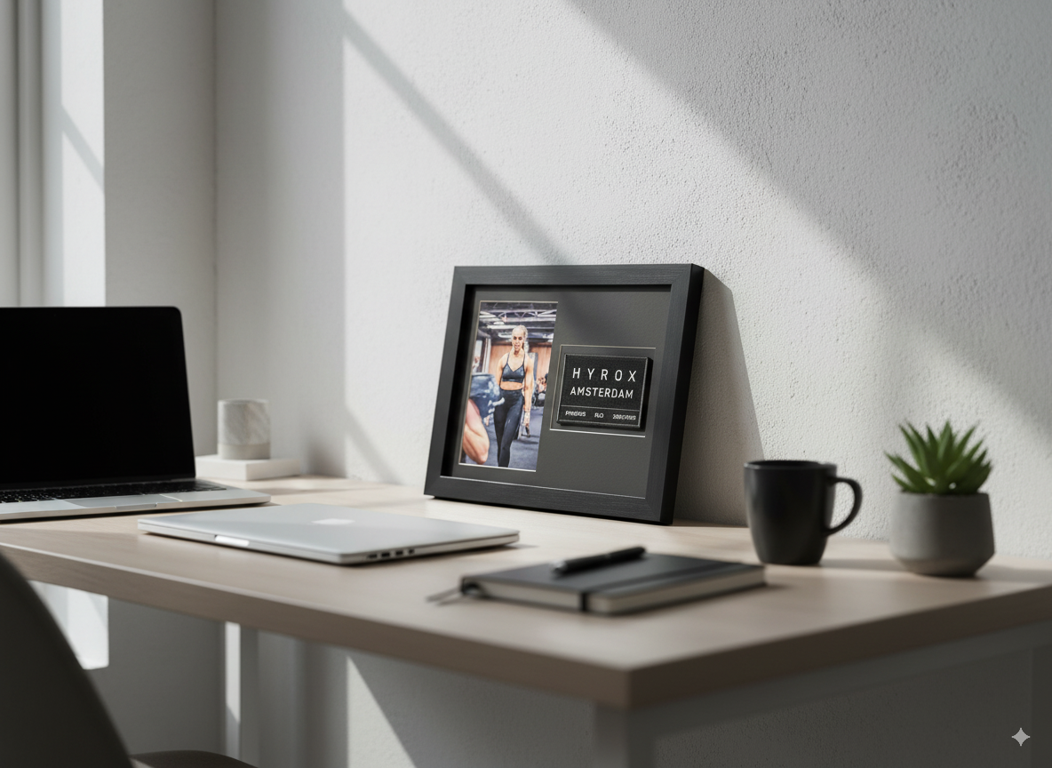 Perfect for desks, shelves, or small wall spaces — this 10x8 frame elegantly displays your Hyrox finisher patch and event photo. Available in both landscape and portrait options.
